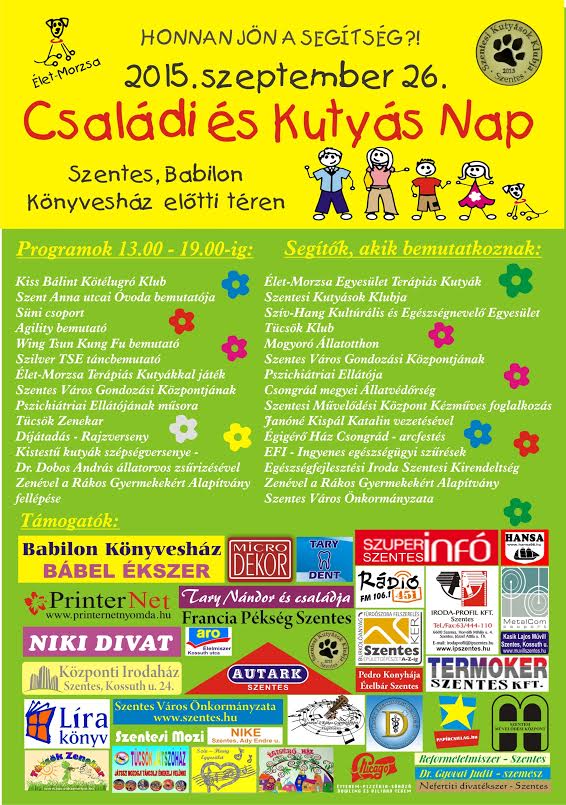 Az Élet-Morzsa egyesület rendezvényére invitál mindenkit a mellékelt plakát. Lehetőség lesz arra, hogy többet megtudjanak az érdeklődők a terápiás kutyákról, alkalmazásukról. Számos kísérő program is hasznos kikapcsolódást nyújt.