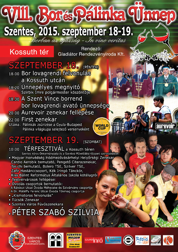 Másnap a mulatság folytatódik a Térfesztivál fellépõinek jóvoltából. A sportos, táncos, kulturális  szombati kavalkád már reggel 9 órakor elkezdõdik a kézmûves sátrak, kirakodó vásár látnivalóival, és késõ estig hívogatja a helyieket egy jó találkozásra, kikapcsolódásra. 10 órakor a Magyar Honvédség Hódmezõvásárhelyi Helyõrségi Zenekara muzsikál a közönségnek. Az azt követõ bemutatók közben gyermekjátékokkal kedveskednek a kicsiknek a szervezõk. Este 7-kor Szentes Város Fúvószenekara lép színpadra. 20.00 órától a sztárvendég Péter Szabó Szilvia, az egykori NOX énekesnõje. Szóló karrierjét 2011. évi angliai tartózkodása alatt alapozta meg. 2013-ban az év énekesnõje, sokunk kedvence.