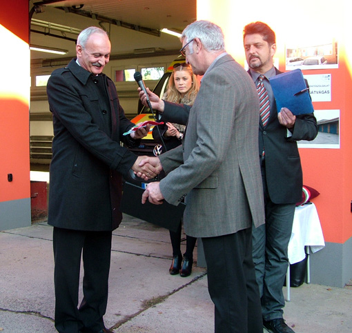 Nagy Béla, a mentőállomás nyugállományba készülő vezetője átveszi az intézmény jelképes kulcsát.