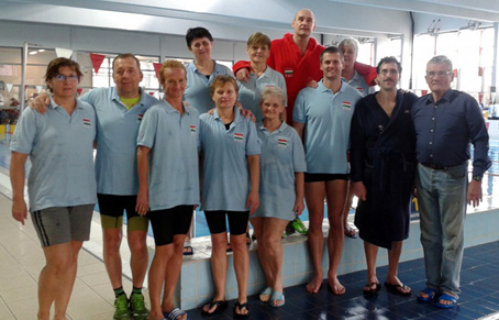 Együtt a versenyen.A VI. Rövidpályás OB-t a százhalombattai Kiss Lászlóról elnevezett uszodában rendezték meg. A magyarországi egyesületeken kívül osztrák, szlovák, orosz versenyzők is részt vettek a kétnapos rendezvényen. A januári I. Évindító Nemzetközi Szenior Úszóversenyhez hasonlóan itt is Európa csúcsot úszott a 95 éves Bánki Horváth Béla és itt is számtalan korosztályos országos csúcs dőlt meg.