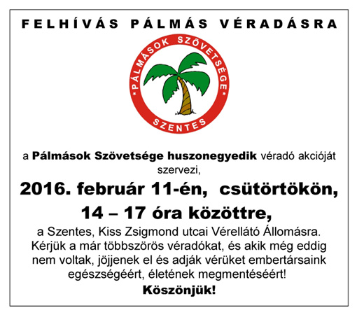 A Pálmások Szövetsége következő véradó programját február 11-én szervezi a Szentesi Vérközpontban. Várják a kedves Véradókat a mellékelt felhívás szerint!