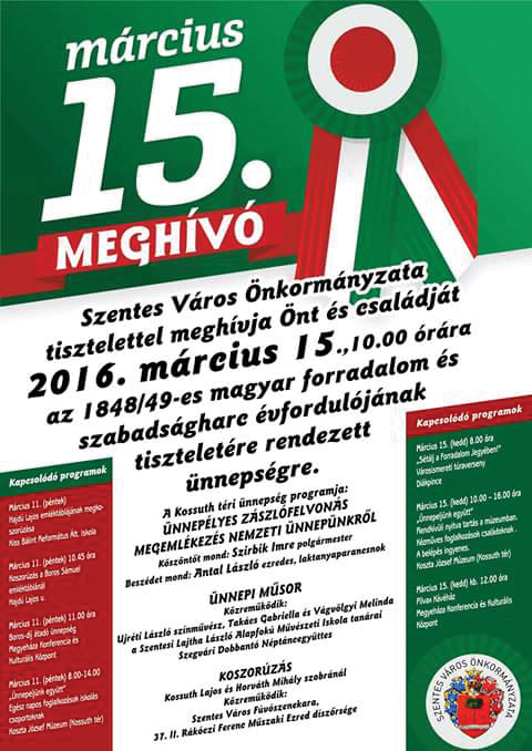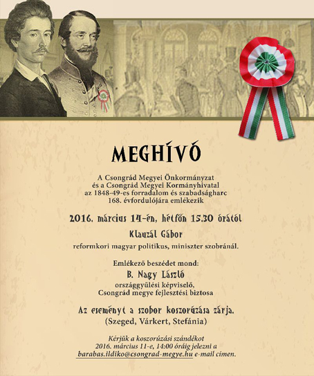 Az 1848/49-es forradalom és szabadságharc helyi hőse Hajdú Lajos emlékét felidéző műsorra és az emléktábla megkoszorúzására március 11-én, pénteken 13.00 órakor kerül sor a Kiss Bálint Református Általános Iskola előtt.