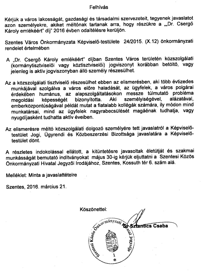 Szentes Város Önkormányzata helyi rendeletet alkotott azon köztisztviselők elismerésére, akik nyugdíjasként, vagy jelenleg munkájukkal, szakmaiságukkal szolgálták, ill. szolgálják a város lakosságát.