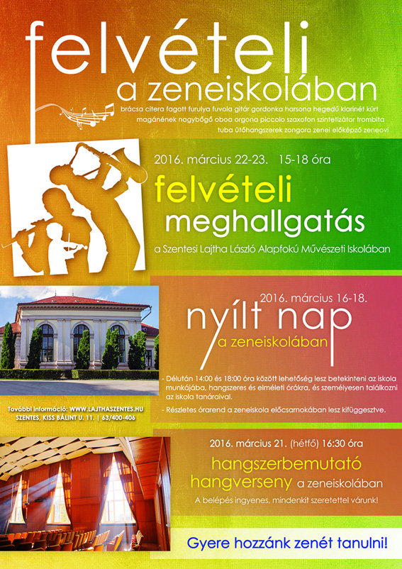 Felvételi 2016.Ezekben a napokban lehet ismerkedni a Lajtha László AMI zene tanítási gyakorlataival, az elkövetkező napokban pedig sor kerül a felvételikre. Most dőlhet el, milyen hangszert választanának szívesen a gyerekek, milyen irányban szeretnék zenei képzettségüket fejleszteni. A részleteket a mellékelt plakát tartalmazza.