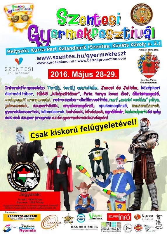 S végezetül: mibe is kerül mindez a családnak? A napijegyeknél gazdaságosabb a két napra szóló bérlet, amely felnőtteknek 1800 Ft, gyerekeknek 2000 Ft. A családi belépő két felnőtt és két gyermek számára a két napra 6000 Ft. Azonban mindezért rengeteg program elérhető. A rendezvényt karszalaggal látogatva, a ki-be jutás folyamatos lehet. A belépő mellé tombola jár, fontos megemlíteni a tombola főnyereményét, amely egy négy csillagos wellness hétvége. A rendezvényről további részleteket ismerhetnek meg a honlapján: www.szentes.hu/gyermekfeszt.