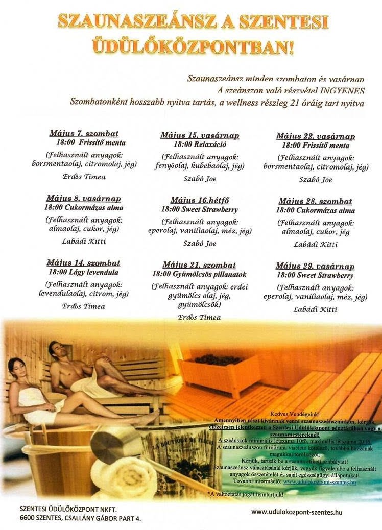 A Szentesi Üdülőközpont NKft. a pünkösdi hétvégén is kényeztető szolgáltatásokkal várja vendégeit. A szaunaszeánszok programját mellékeljük. Május 16-ig kreatív sarok nyújt hasznos kikapcsolódást az ügyes kezű és a vetélkedést kedvelő gyerekek számára.