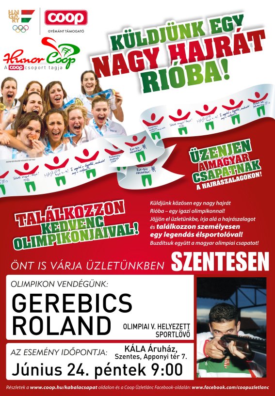Olimpikon SzentesenIsmét eljött az ötkarikás világverseny éve! A COOP, a Magyar Olimpiai Csapat gyémánt fokozatú támogatójaként, az athéni, a pekingi és a londoni olimpia után immár 4. alkalommal indítja útjára szurkolói mozgalmát „Küldjünk egy nagy hajrát Rióba!” címmel az olimpiai eszme népszerűsítése érdekében. Célunk, hogy összegyűjtsük Magyarország leghosszabb szurkolói szalagját, hogy a COOP vásárlói, Szentes és térségének lakosai, diákjai megismerkedjenek egy-egy hazai olimpikonnal, ezáltal felkeltsük az érdeklődést a riói ötkarikás játékok iránt.