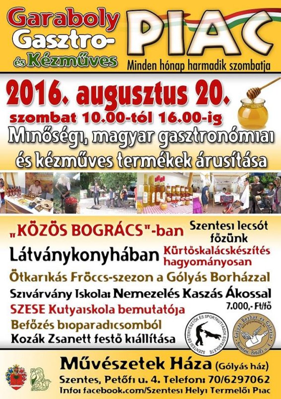 Augusztus 20. 10.00-16.00 óra: Garaboly Gasztro- és Kézműves Piac (Művészetek Háza).