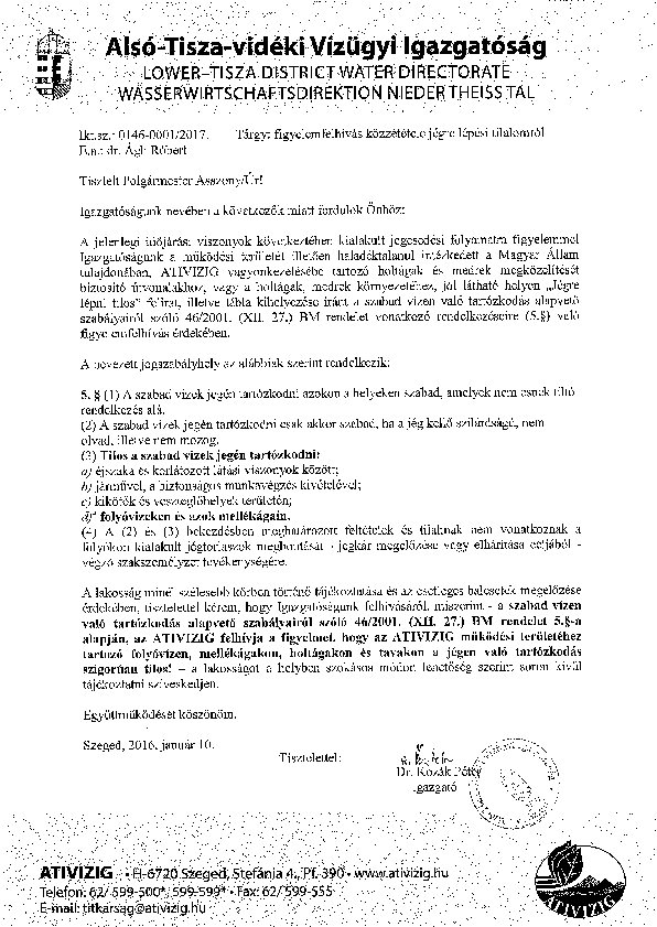 Mellékelten adjuk közre az Alsó-Tisza-Vidéki Vízügyi Igazgatóság figyelemfelhívását arról, hogy a holtágakon, tavakon hol és milyen körülmények között szabad a jégen tartózkodni. Ahol a „Jégre lépni tilos!” táblák megjelennek, a figyelmeztetést komolyan kell venni! A részletek a mellékletben olvashatók el.