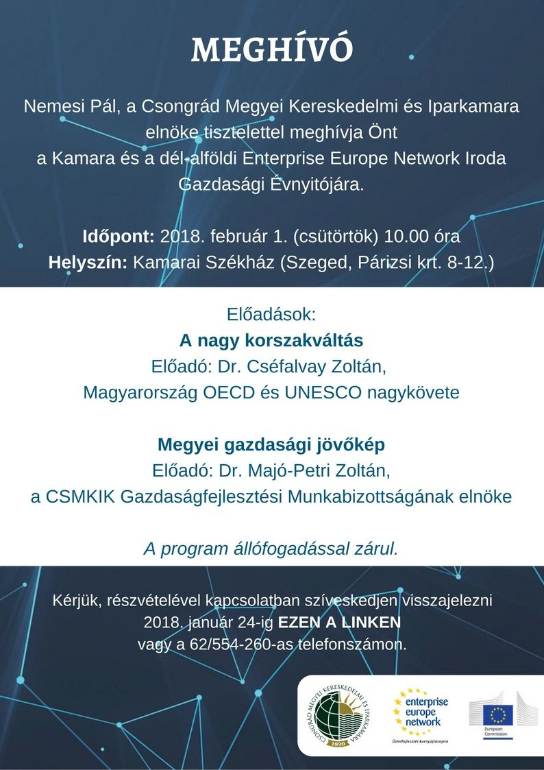 A Csongrád Megyei Kereskedelmi és Iparkamara szokásos év elejei Gazdasági Évnyitójára invitálja az érdeklődőket a csatolt plakát. A február 01-én, csütörtökön, 10 órakor kezdődő program Szegeden lesz.