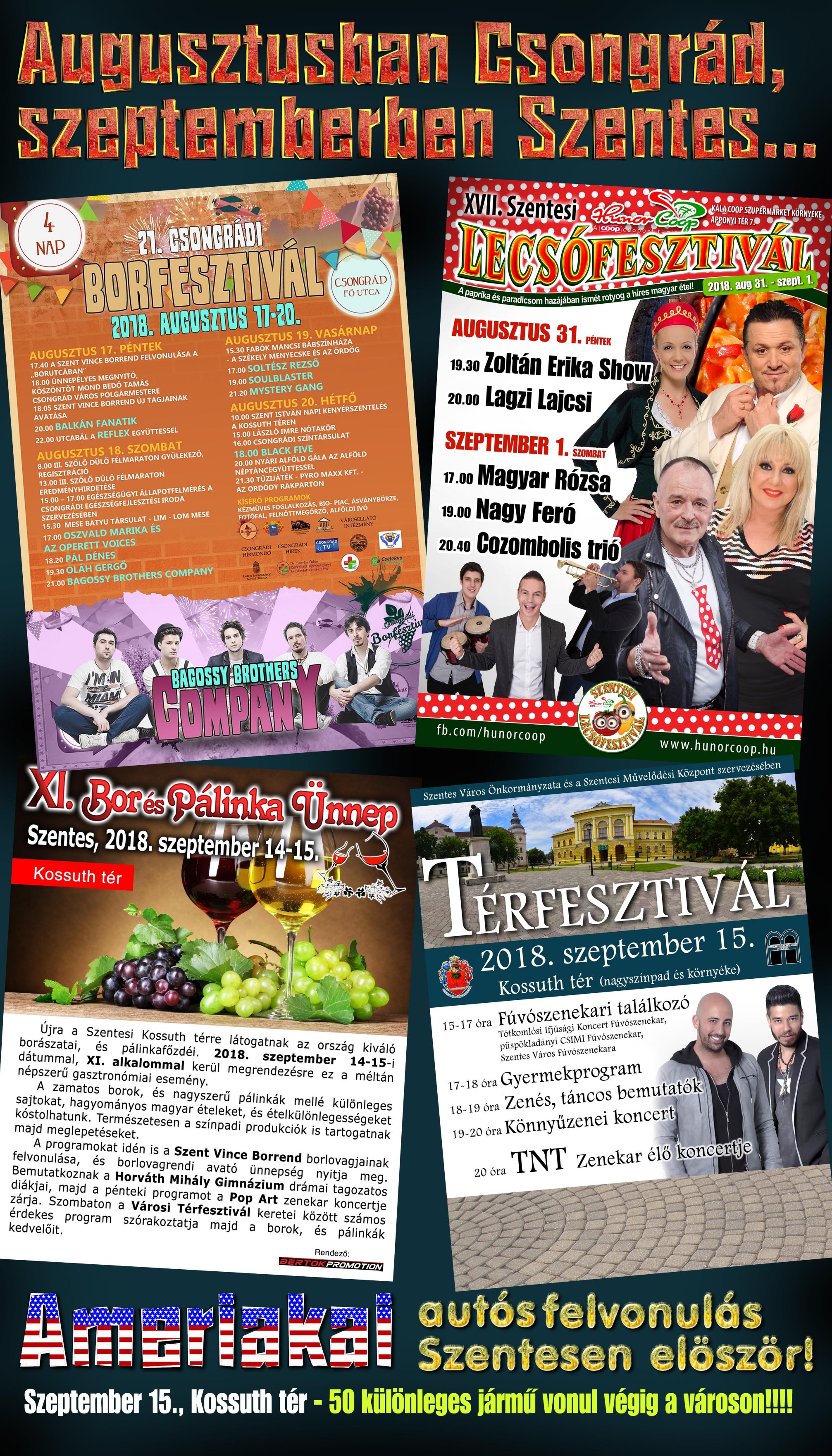 Bedő Tamás hozzátette, hogy több csongrádi csapat is részt vesz rendszeresen a Lecsófesztiválon Szentesen. Ezen a hétvégén pedig négy napon át a Borfesztivál eseményei és fellépői várják a szentesieket Csongrádon. Augusztusban és szeptemberben szinte minden hétvégén lesz program valamelyik városban, ezért is adták az „Augusztusban Csongrád, szeptemberben Szentes…” mottót a közös megjelenésnek.