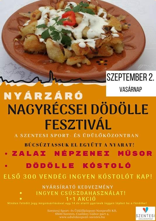 A Szentesi Sport- és Üdülőközpontban egy különleges programmal búcsúztatják a szezont szeptember 2-án. Nagykanizsa közelében és Nagyrécsén van komoly hagyománya a dödölle készítésének, fogyasztásának. A hagyományos korabeli étel alapanyaga liszt és krumpli, egyszerű elkészíteni, laktató. A hajdani pásztor népek, földművesek éppen azért szerették, mert ha reggelire dödöllét ettek, egész nap bírták a munkát.