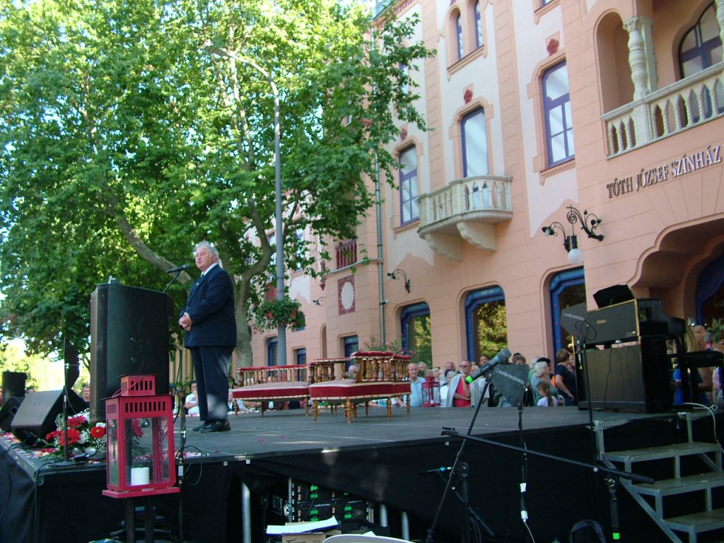 Kiemelte a polgári értékrend viszonyulását a magyar nyelvhez és kultúrához, majd köszönetet mondott Fekete Péter államtitkárnak és Vidnyánszky Attilának, a Nemzeti Színház főigazgatójának, a Magyar Teátrumi Társaság elnökének, hogy biztosították a szakmai és anyagi hátteret a színház működéséhez.