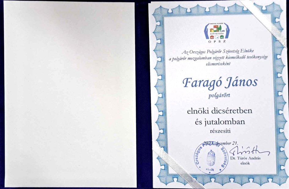December 21-én a Demjén községben megrendezett ünnepségen dicsérettel és jutalommal ismerte el az Országos Polgárőr Szövetség elnöke az idei évben kiemelkedő teljesítményt nyújtó polgárőrök munkáját. Dr. Túrós András, a vármegyei elnökök javaslatára ötvenhárom polgárőrt részesített elismerésben, köztük Faragó Jánost, a Szentes Polgárőr Egyesület elnökét.