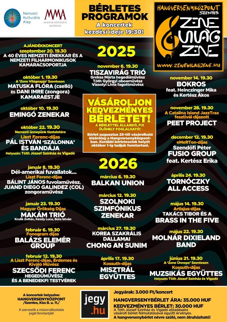 Kertész Ákos elmondta, hogy a Tóth József Színház és Vigadót üzemeltető Szegedi Pinceszínház jelen lévő képviselőivel megállapodtak abban, hogy programjaikat egymás programjaihoz igazítják az időpont egybeesések elkerülése érdekében. Továbbá azok a bérletesek, akik – akár a Zene – Világ – Zene sorozatra, akár a színházi előadásokra váltottak, vagy ezután váltanak bérletet – kölcsönös kedvezményben részesülnek, egyidejűleg a bérletük felmutatásával.