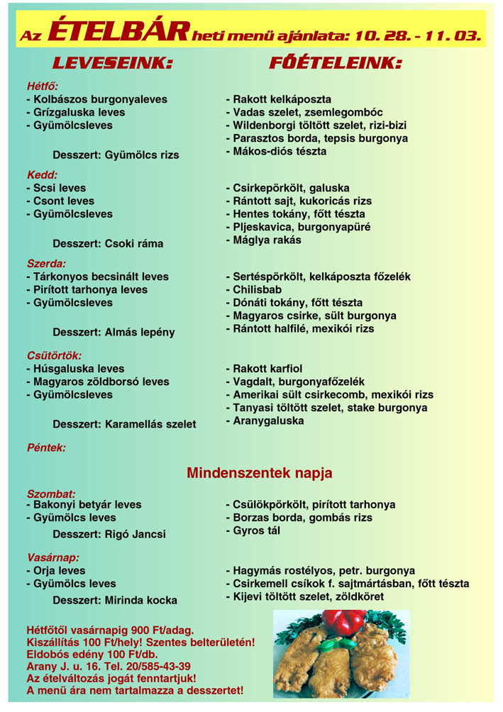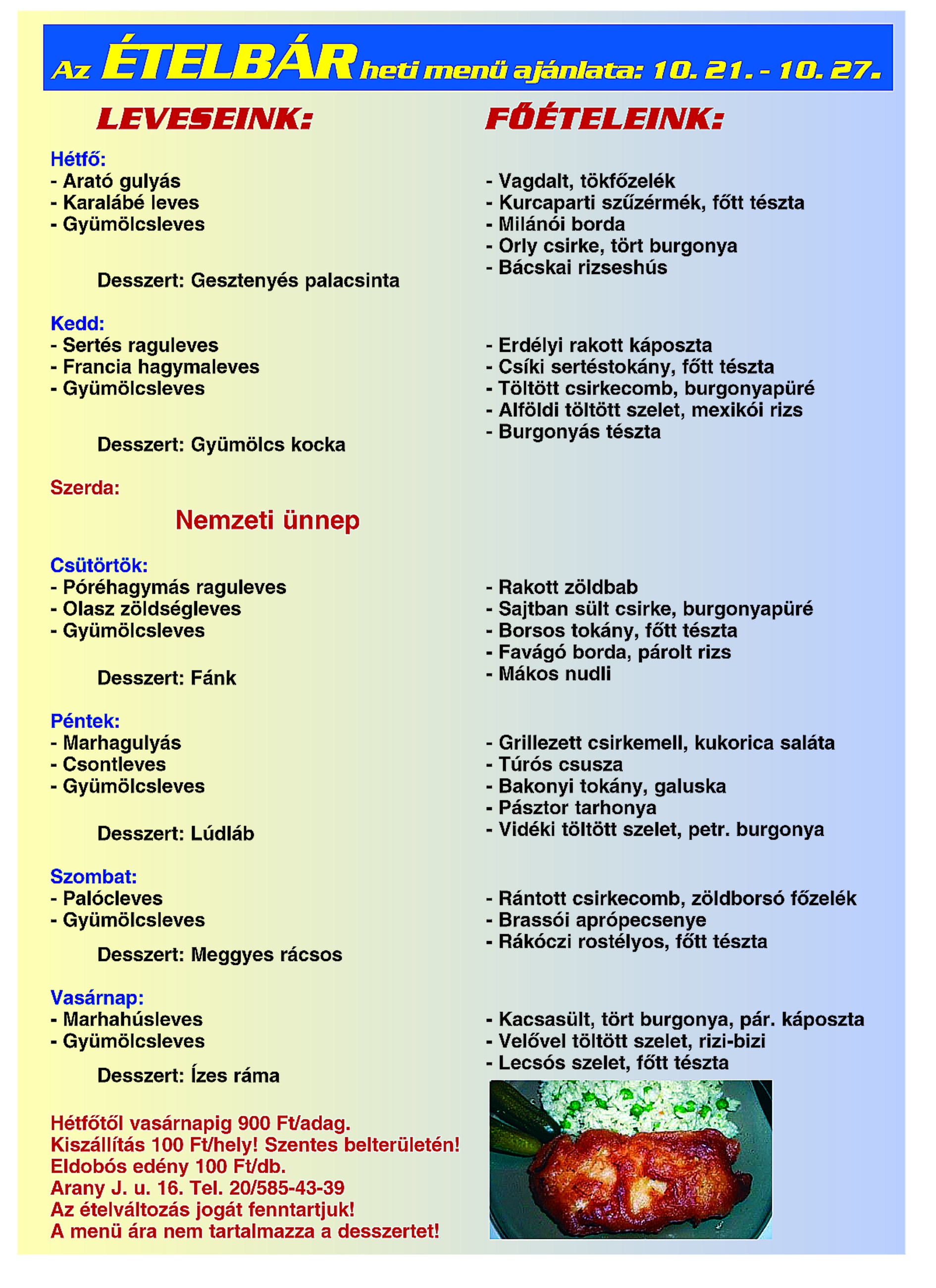 A Nemzeti Ünnepre figyelemmel, a hét hat napján a melléklet szerinti ételek közül választhat Szentesen, az Arany János utca 16. szám alatti Ételbárban, ahol továbbra is a finom ízek és a bőséges kínálat a meghatározó.
