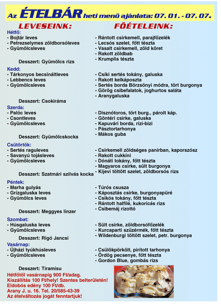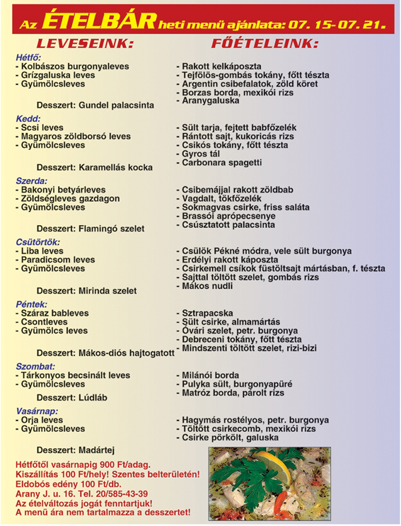 Finom és változatos ételekkel ismét közöljük a Szentes Arany János u. 16. szám alatt található Ételbár ajánlatát. Válasszanak kedvükre, jó étvágyat hozzá.