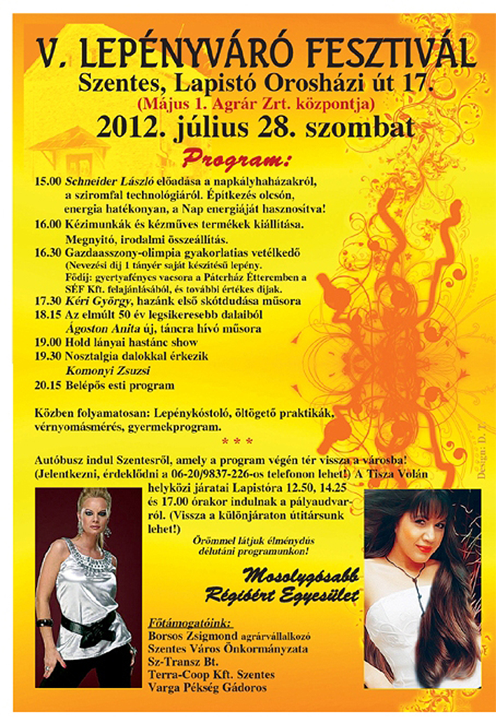 Szerény jó indulattal mondhatjuk a Szentestõl tizenhárom kilométerre lévõ Lapistóról, hogy egy város széli oázis, ám helyzeténél fogva ez a legjobb jelzõ. Mivel nem önálló település, ezért nem élvezheti a környezõ, ötezres statisztikai lélekszám alatti falvak elõnyeit. Szentes belterületeként a városrészek esélyeiért verseng, s abban, hogy talán nem marad le, figyelemfelhívó mozzanat volt a július 25-én rendezett II. Lepényváró Fesztivál eseménysora.