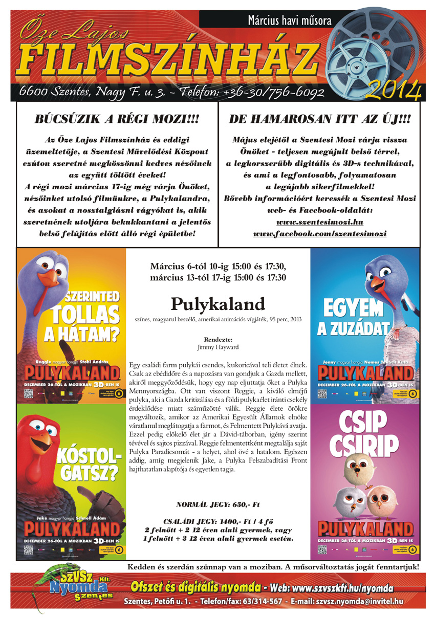 A megújulás alatt álló Őze Lajos Filmszínház ezekben a napokban egy kedves, színes, magyarul beszélő, amerikai animációs vígjátékkal kedveskedik látogatóinak. Részletek a mellékletben.