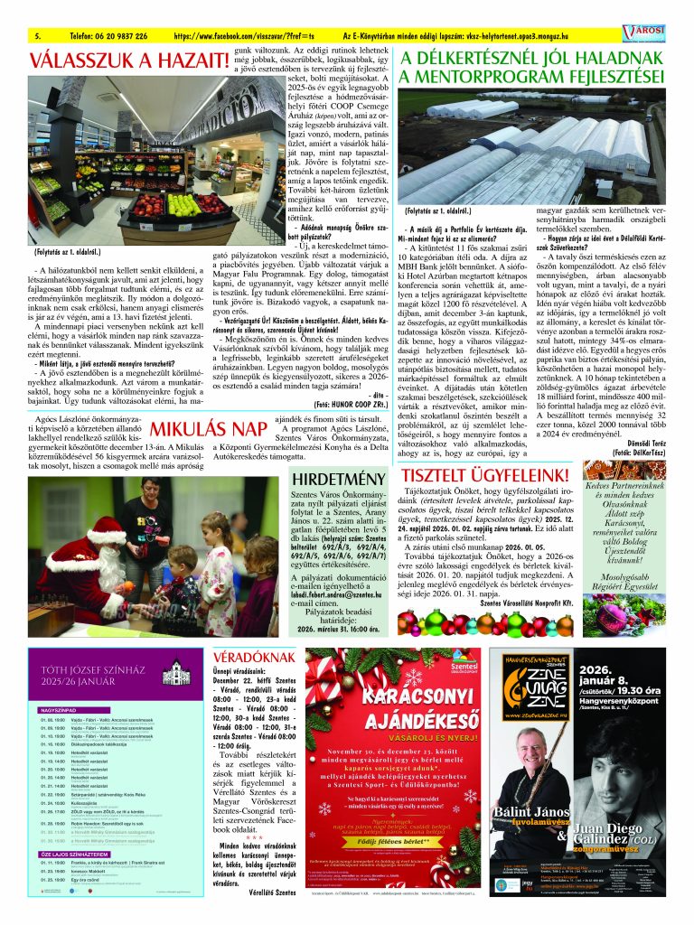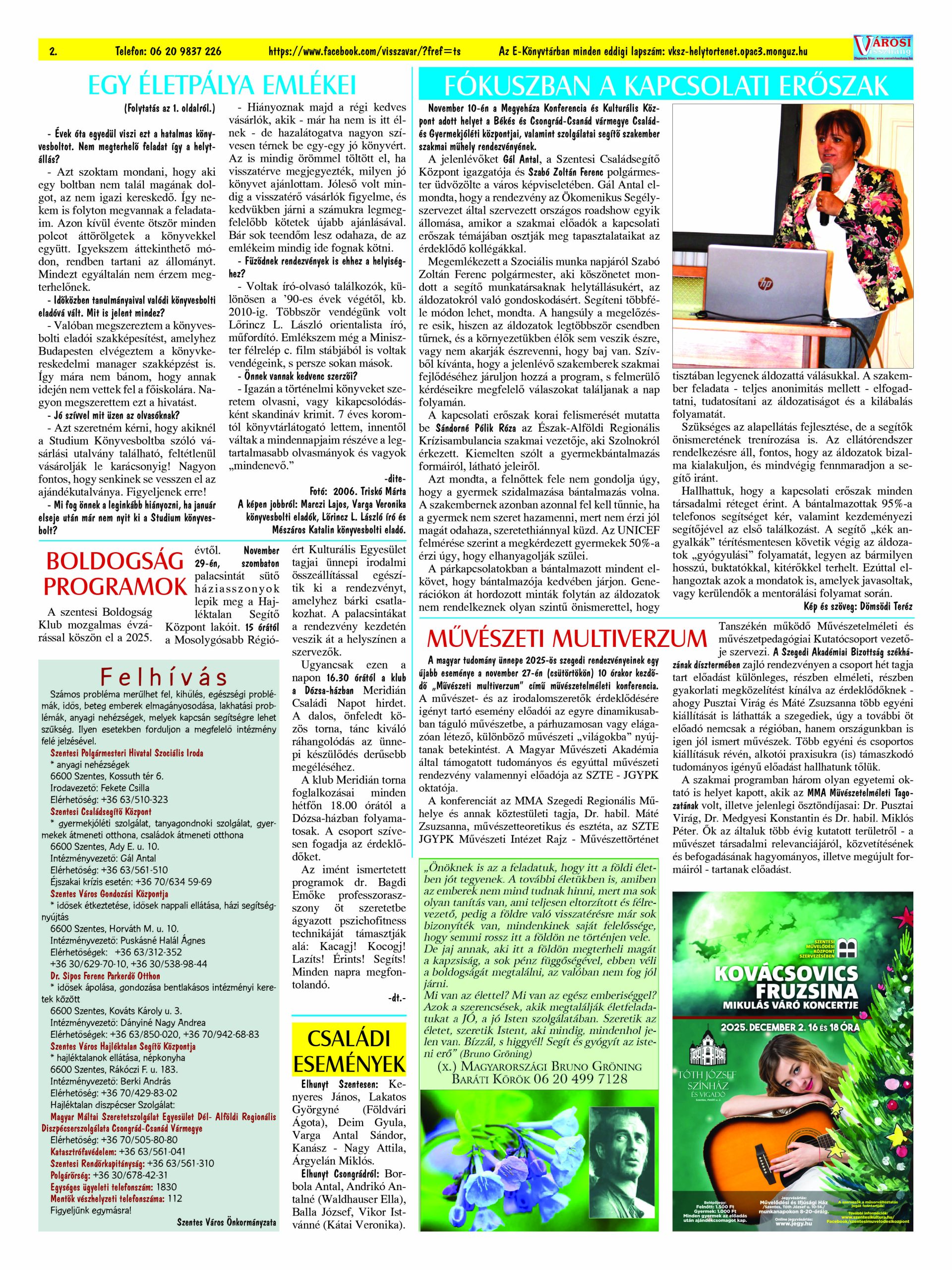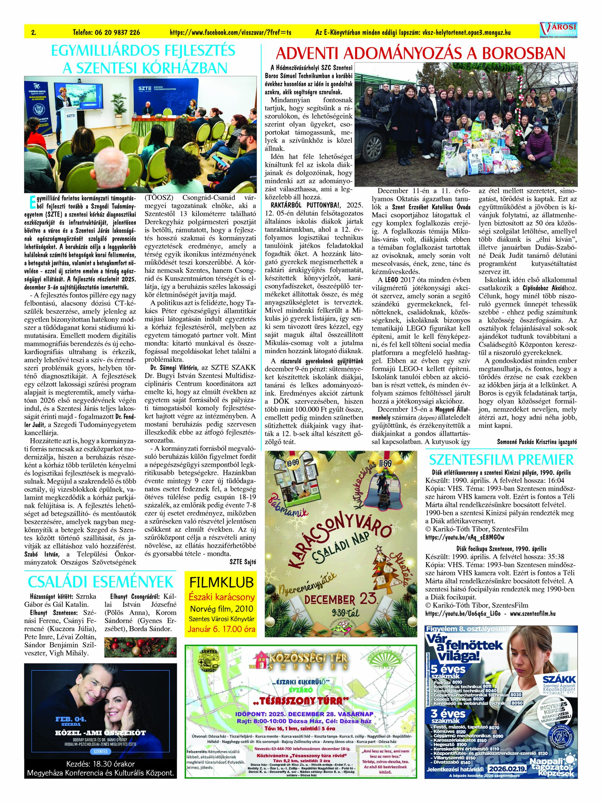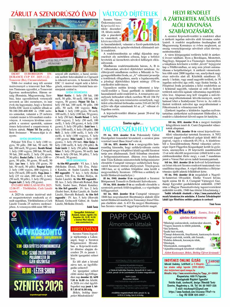 Ön a Városi Visszhang 2025. december 16-án megjelent 12. lapszámát olvassa. (Nagyításért katt a képre!) Elérhetőségünk az E-könyvtárban: https://vksz-helytortenet.opac3.monguz.hu/hu/record/-/record/VKSZHT37176, az összes eddig megjelent lapszámunk pedig (1991 és 2025 között) a https://vksz-helytortenet.opac3.monguz.hu weboldalon érhető el. Kellemes és hasznos böngészést kívánunk a megújult E-könyvtárban is.