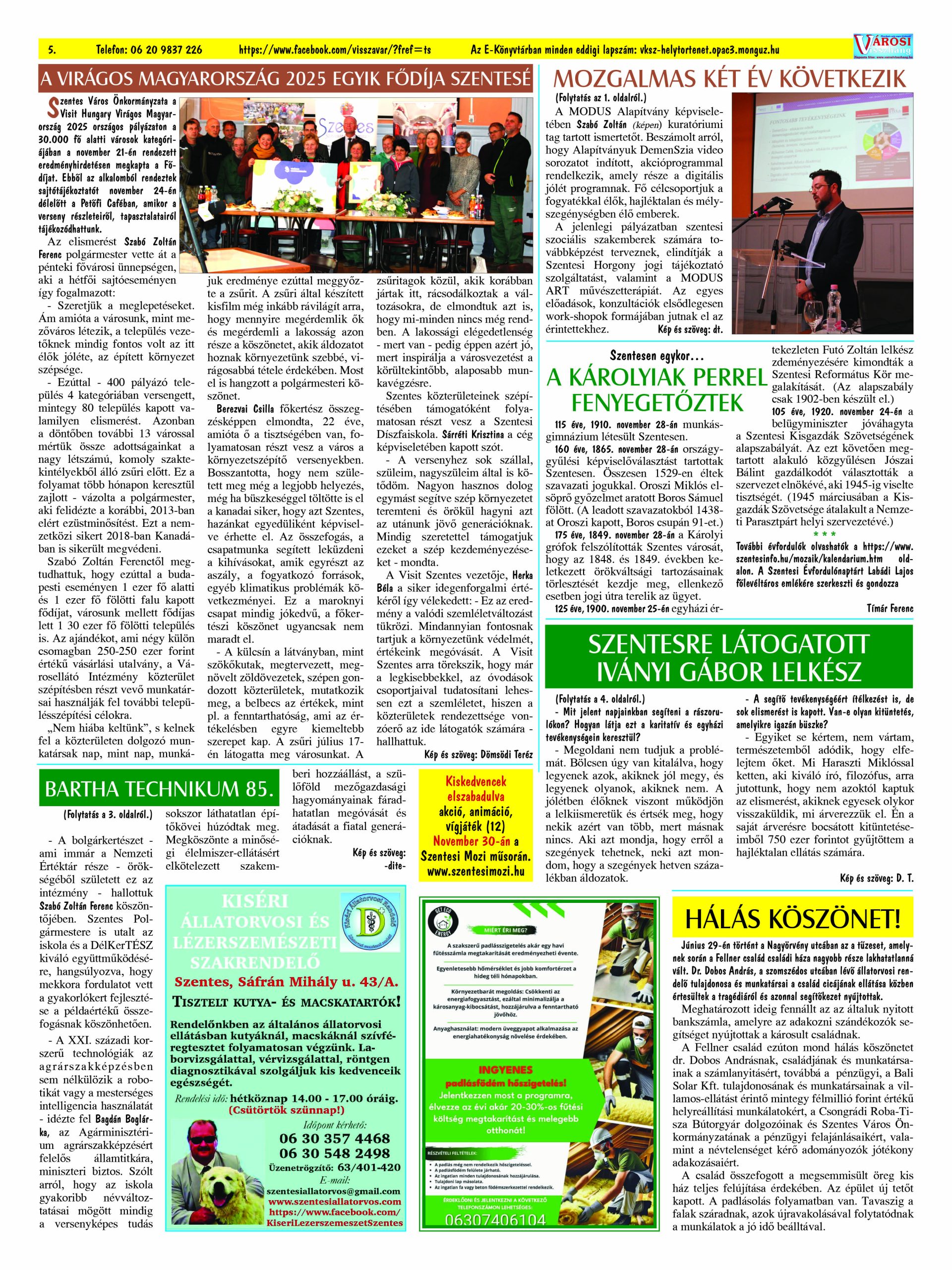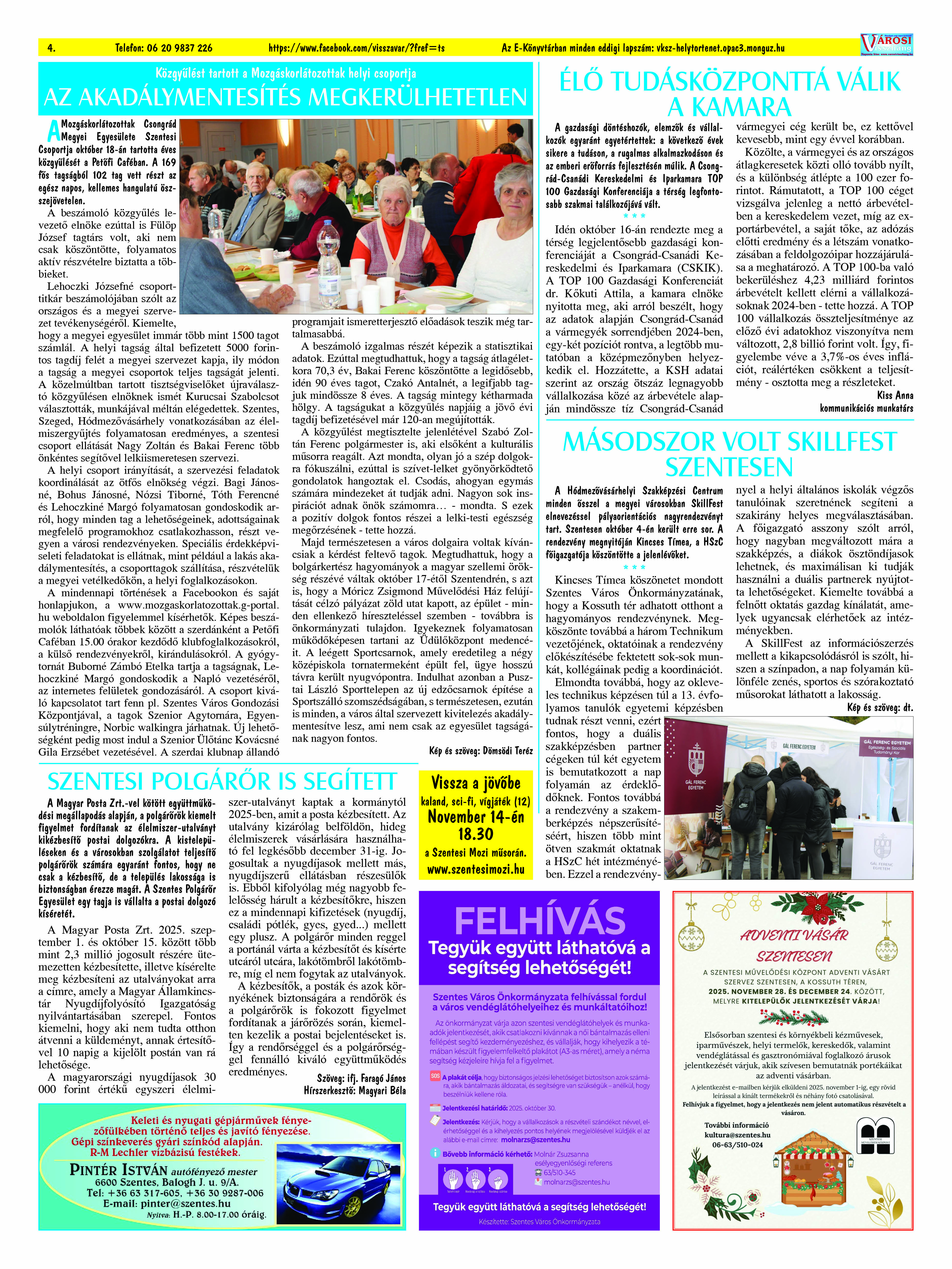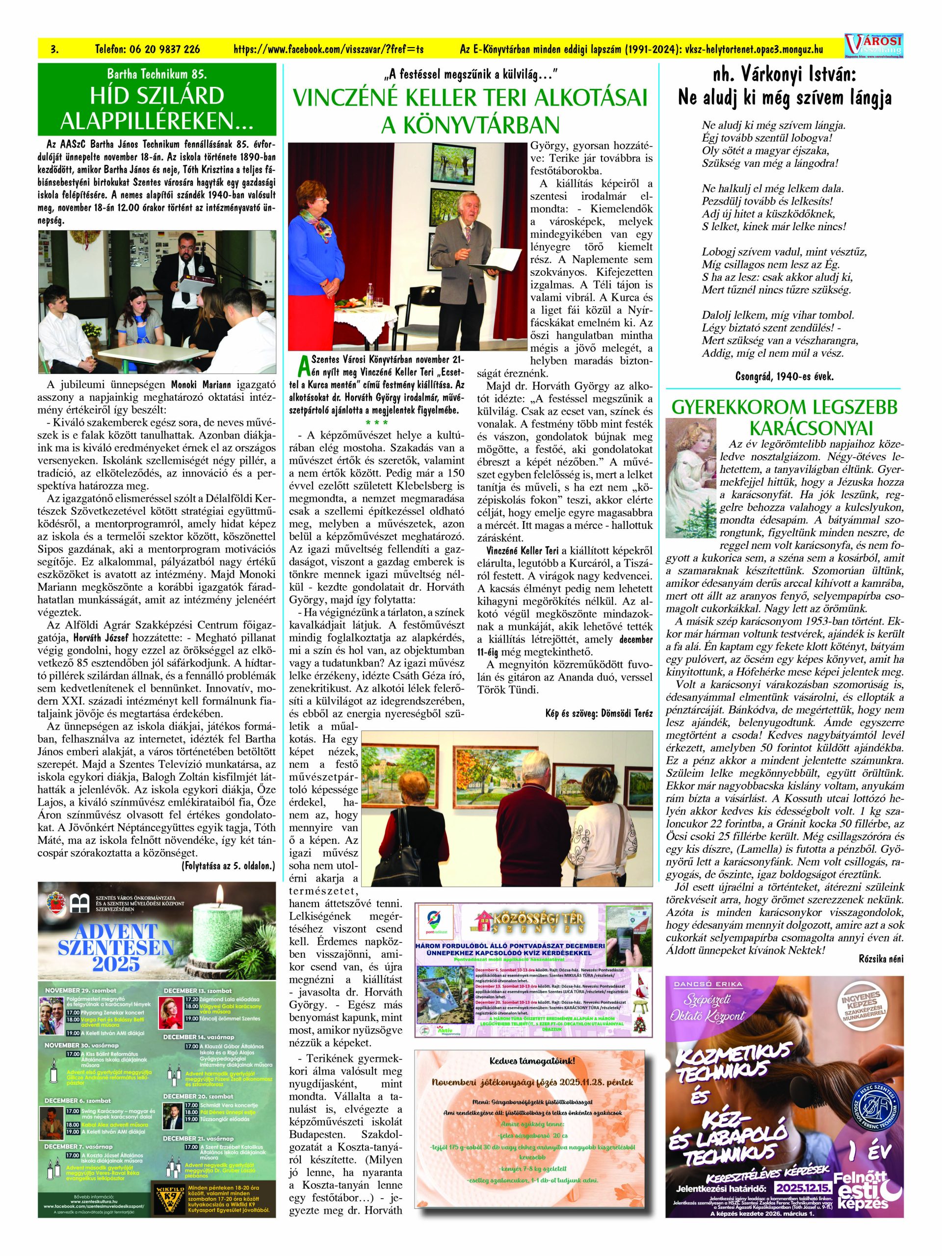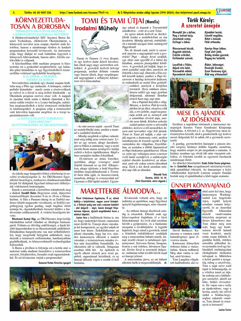 Ön a Városi Visszhang 2025. december 16-án megjelent 12. lapszámát olvassa. (Nagyításért katt a képre!) Elérhetőségünk az E-könyvtárban: https://vksz-helytortenet.opac3.monguz.hu/hu/record/-/record/VKSZHT37176, az összes eddig megjelent lapszámunk pedig (1991 és 2025 között) a https://vksz-helytortenet.opac3.monguz.hu weboldalon érhető el. Kellemes és hasznos böngészést kívánunk a megújult E-könyvtárban is.