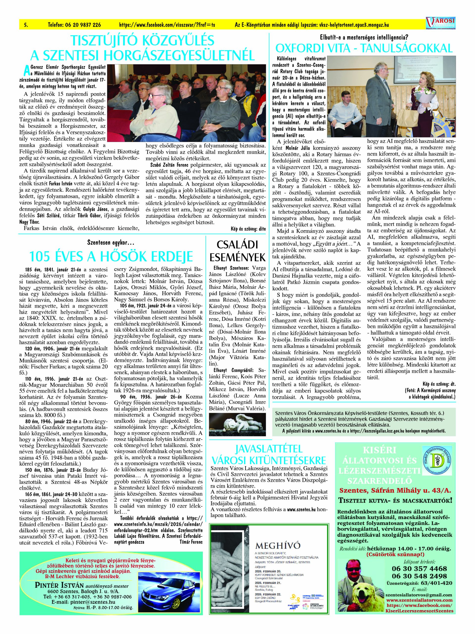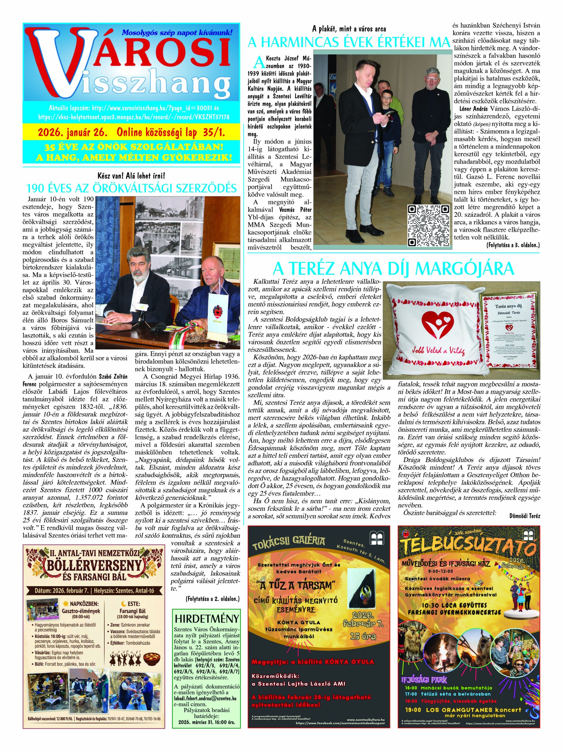 Ön a Városi Visszhang 2026. január 26-án megjelent 1. lapszámát olvassa. Elérhetőségünk az E-könyvtárban: https://vksz-helytortenet.opac3.monguz.hu/hu/record/-/record/VKSZHT37178, az összes eddig megjelent lapszámunk pedig (1991 és 2025 között) a https://vksz-helytortenet.opac3.monguz.hu weboldalon érhető el. Kellemes és hasznos böngészést kívánunk a megújult E-könyvtárban is.