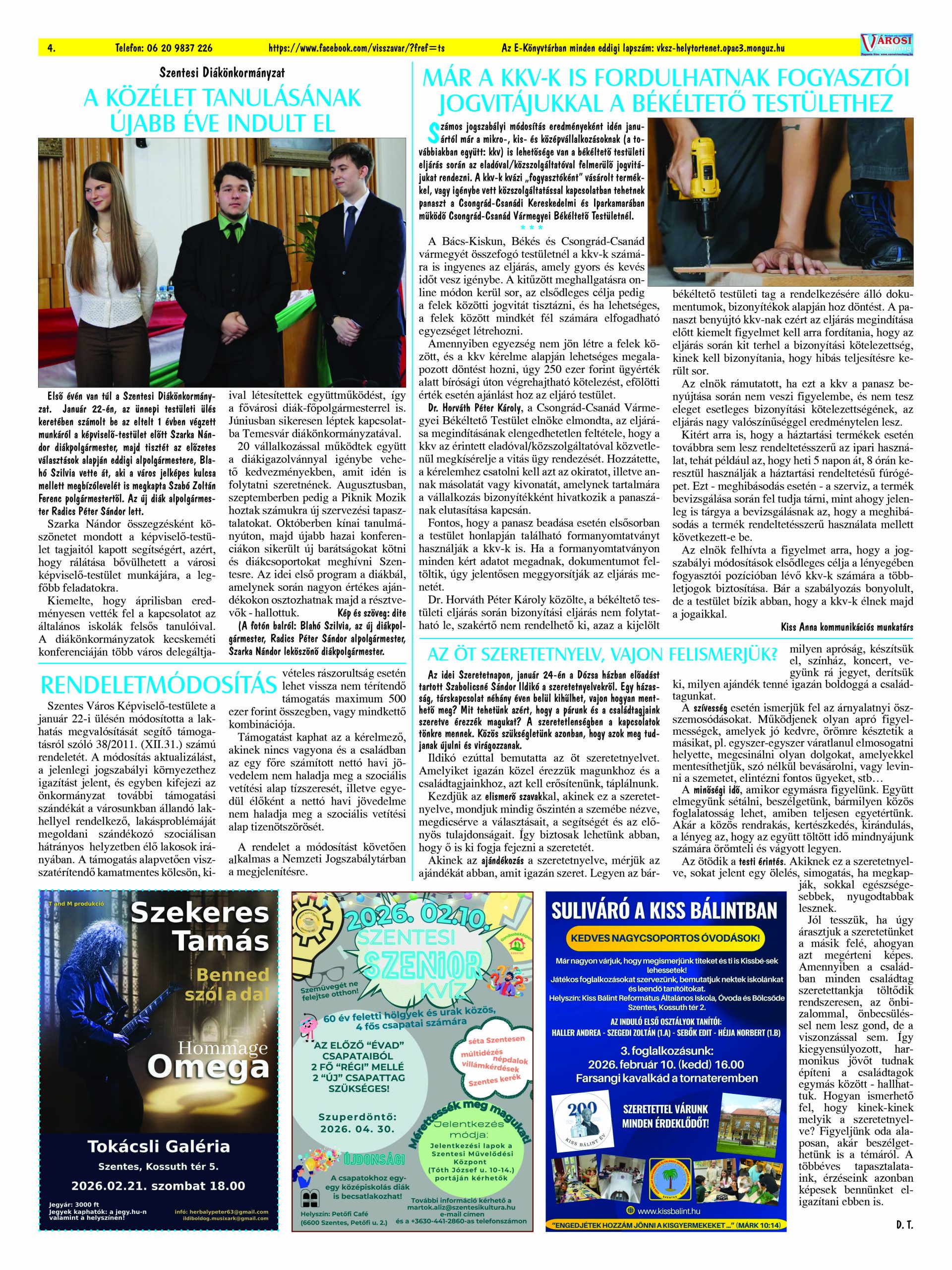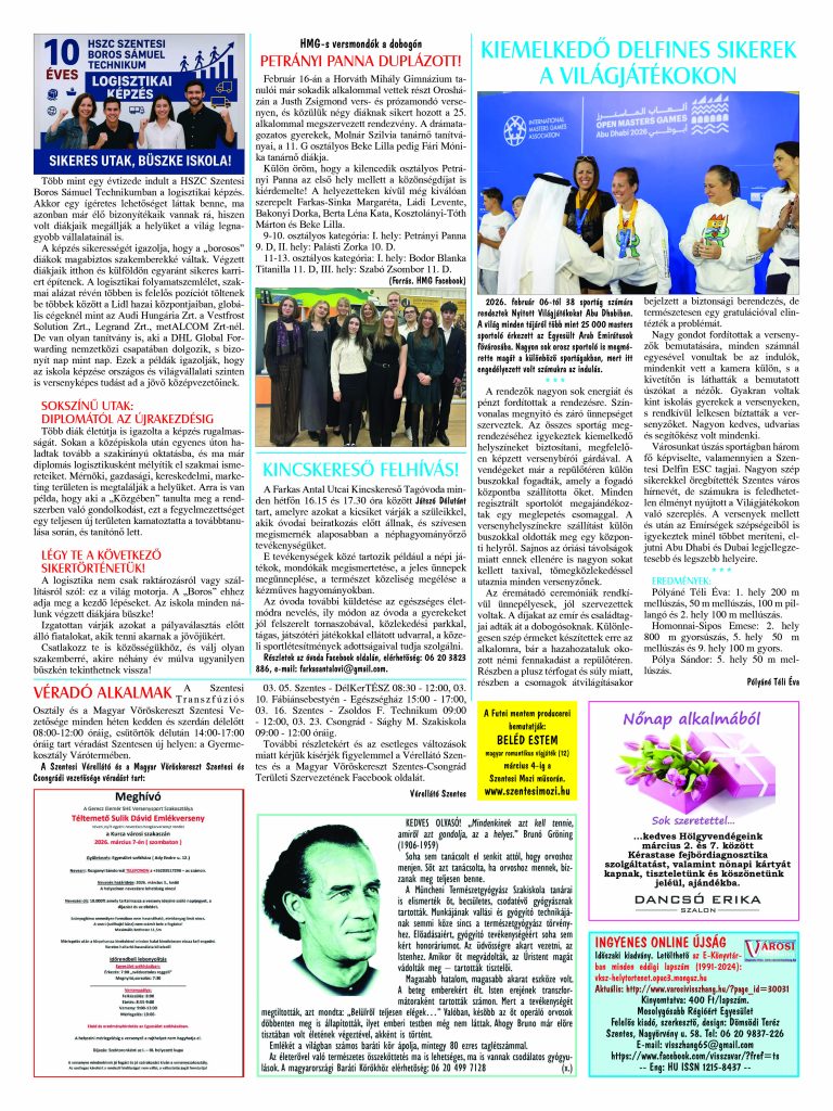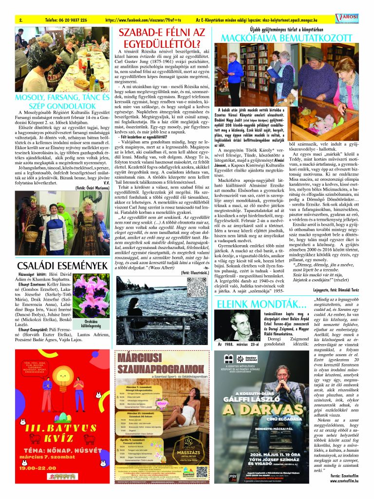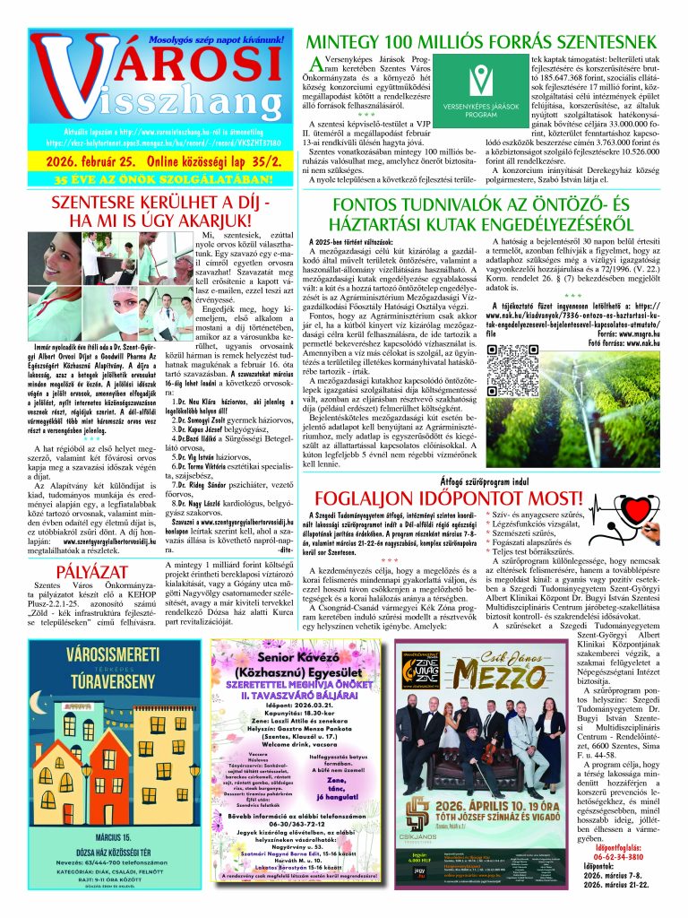 Ön a Városi Visszhang 2026. február 25-én megjelent 2. lapszámát olvassa. Elérhetőségünk az E-könyvtárban: https://vksz-helytortenet.opac3.monguz.hu/hu/record/-/record/VKSZHT37180, az összes eddig megjelent lapszámunk pedig (1991 és 2025 között) a https://vksz-helytortenet.opac3.monguz.hu weboldalon érhető el. Kellemes és hasznos böngészést kívánunk a megújult E-könyvtárban is.