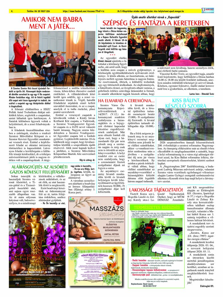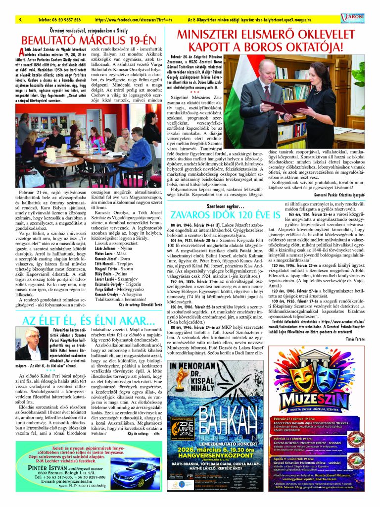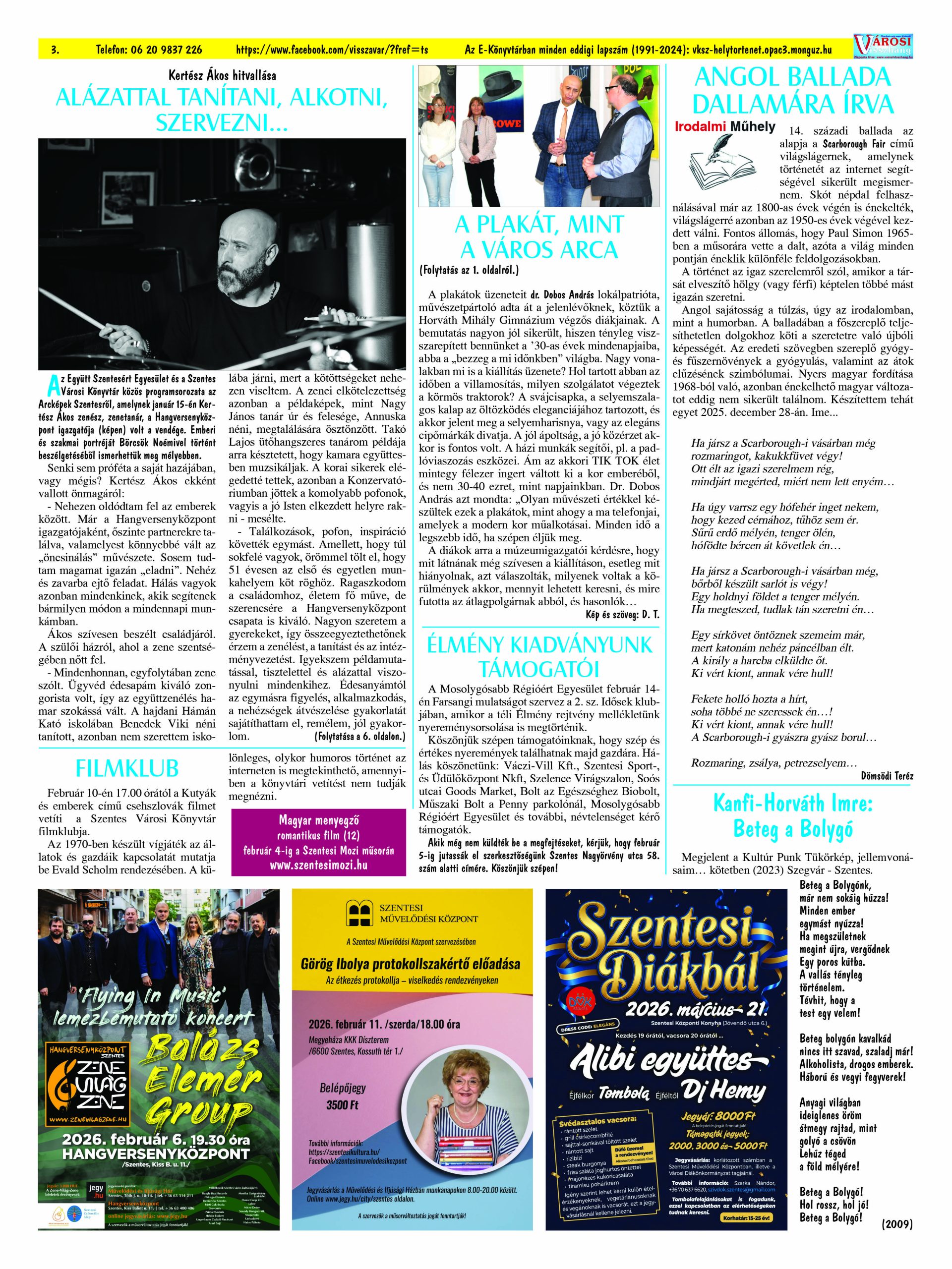 Ön a Városi Visszhang 2026. február 25-én megjelent 2. lapszámát olvassa. Elérhetőségünk az E-könyvtárban: https://vksz-helytortenet.opac3.monguz.hu/hu/record/-/record/VKSZHT37180, az összes eddig megjelent lapszámunk pedig (1991 és 2025 között) a https://vksz-helytortenet.opac3.monguz.hu weboldalon érhető el. Kellemes és hasznos böngészést kívánunk a megújult E-könyvtárban is.